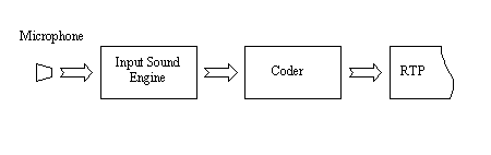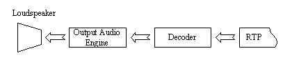 In case of the input stream, as showed at Figure 2-1, the sound is taken from the microphone, sampled and prepared by the Input Audio Engine. Next, it is encoded and sent to the Real Time Protocol (RTP) process. The RTP process puts the encoded sound (payload) into the special frame and sends it to the network. In case of the output sound (Figure 2-2), the sound payload is taken from the RTP process, then decoded and sent to Output Audio Engine, responsible for continuous playing of the audio signal.The RTP module is beyond the scope of this work. Coder Modules and Decoder Modules are very simple from the user point of view. They are usually procedures that get a block of data and return the other ("encoded" or "decoded") data block. The remaining work is done by the Capturing and Playing Module. Luckily, low-leveled sampling is performed by OS and sound device. It is the Capturing and Playing Module that supports real-time capturing and playing of the sounds. It is Capturing and Playing Module that examines sound devices and their capabilities. Finally, it is Capturing and Playing Module that fills the empty space when sound frames are not received from the network.